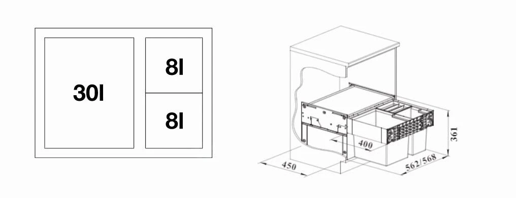 El cubo de basura empotrado Blanco Select está diseñado para un mueble bajo con un cajón con unas dimensiones mínimas de 600 mm de ancho, 361 mm de alto y 400 mm de profundidad. El contenedor también puede incorporarse a un mueble bajo con una puerta de casete con un marco de 40 mm.