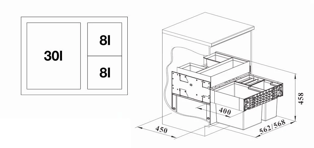- recipientes: 1 x 30 l, 2 x 8 l, 1 x cajón