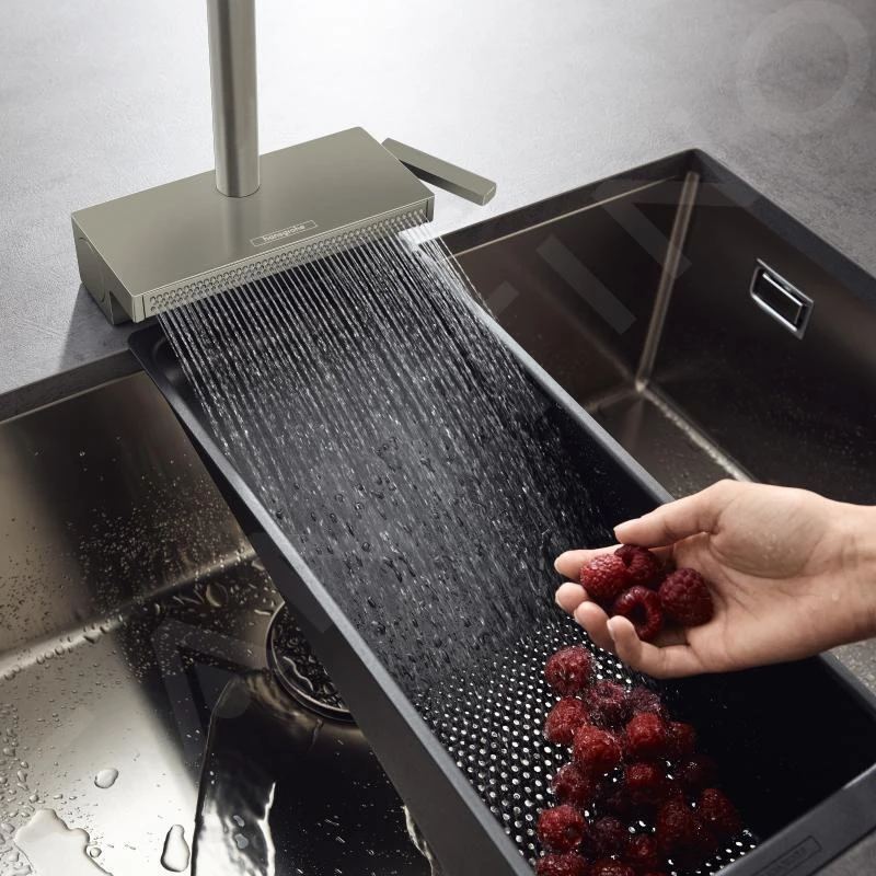 grifo de cocina con un tipo de chorro de ducha laminar totalmente nuevo SatinFlow, que está compuesto por 133 chorros de agua individuales y finos. Éstos envuelven con suavidad y eficacia los ingredientes delicados, lo que permite lavarlos más a fondo y con más cuidado. Otra gran solución es el uso de un escurridor multifuncional, que está diseñado para encajar perfectamente bajo el chorro laminar del grifo de la cocina.