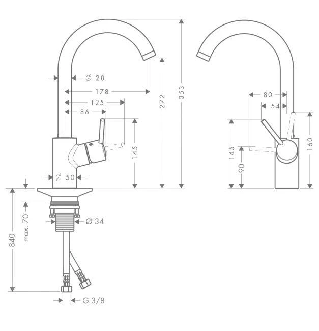 El rango de giro puede ajustarse a 110°, 150° o 360° para una máxima comodidad en un fregadero individual o doble o en una isla de cocina. El caudal es de hasta 10 litros por minuto, lo que permite llenar rápidamente fregaderos y ollas. El grifo de cocina también es apto para calentadores de agua instantáneos.